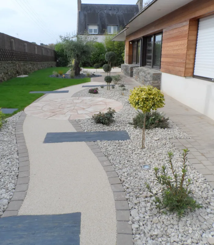 Allées en pavés, béton décoratif pour une circulation fluide et élégante.